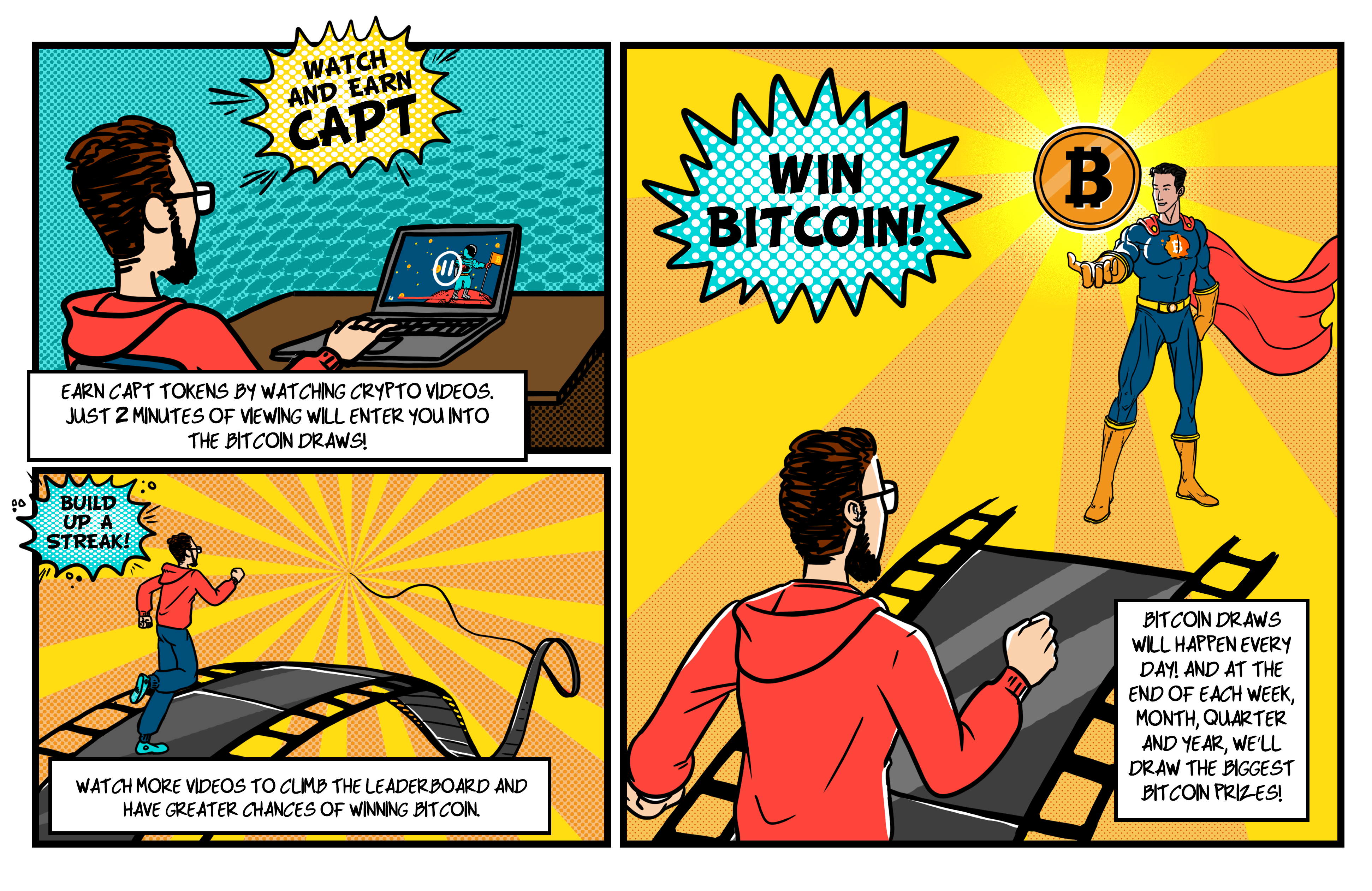 Even if you don't win any Bitcoin, you still earn CAPT tokens simply by watching blockchain and crypto related videos. You will be able to exchange your CAPT tokens for Bitcoin on the platform with just one click.